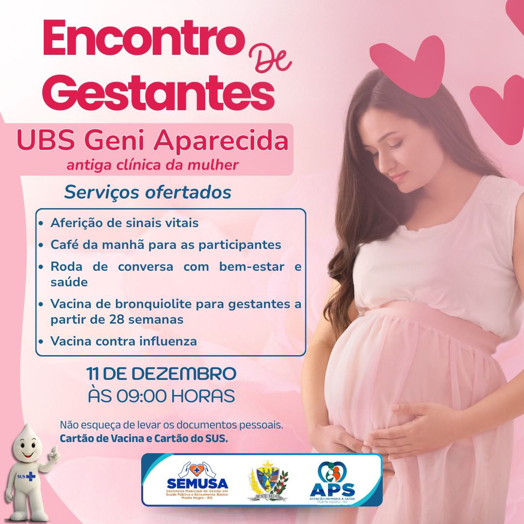 Nesta quinta-feira, 11 de dezembro, será realizado o Encontro de Gestantes na UBS Geni Aparecida.