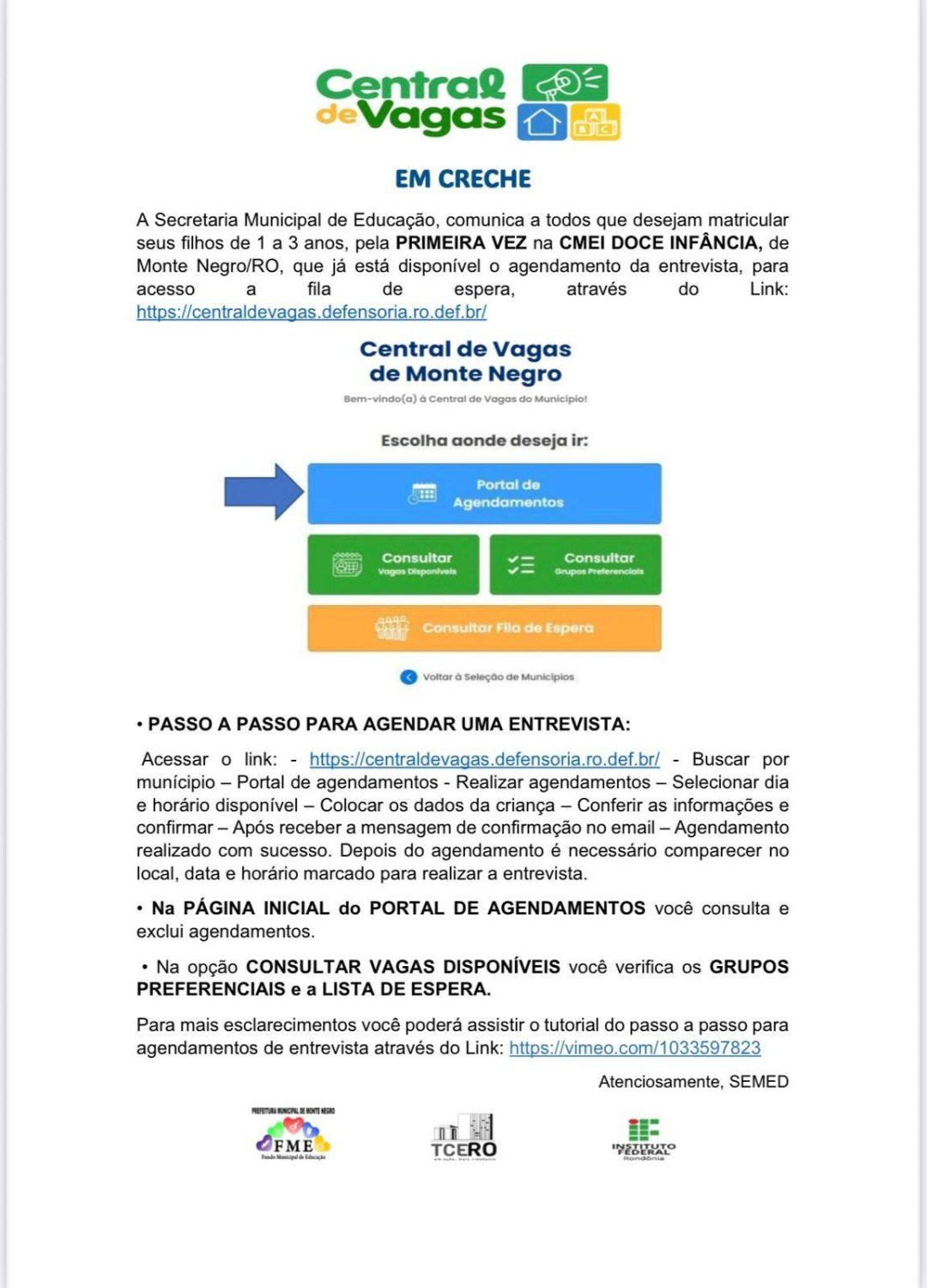 A Central de Vagas em Creche é um sistema digital e presencial, implantado por Prefeituras e Secretarias Municipais de Educação em Rondônia, com o apoio do Tribunal de Contas do Estado de Rondônia (TCE-RO), da Defensoria Pública do Estado (DPE-RO) e desenvolvido pelo Instituto Federal de Rondônia (IFRO).
