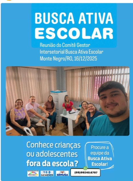 Na data de 16 de dezembro de 2025, o município de Monte Negro (RO) realizou a Reunião do Comitê Gestor Intersetorial da Busca Ativa Escolar, reunindo representantes das secretarias municipais e demais órgãos parceiros envolvidos na política de garantia do direito à educação.