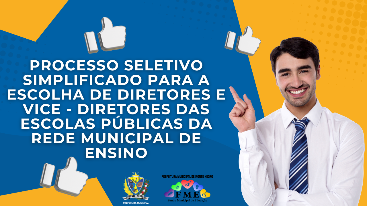 A Prefeitura Municipal de Monte Negro informa à população que está aberto o Processo Seletivo Simplificado destinado à escolha de Diretores e Vice-Diretores das escolas públicas da Rede Municipal de Ensino.