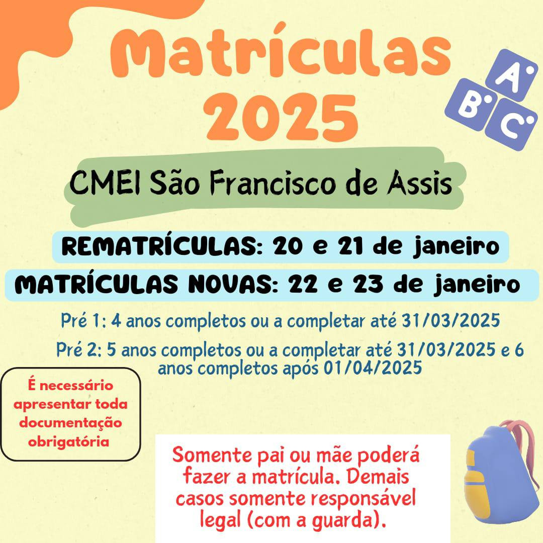 O Centro Municipal de Educação Infantil (CMEI) São Francisco de Assis comunica que o período de rematrícula e matrículas para novos alunos está definido. É fundamental que os responsáveis estejam atentos às datas e requisitos para garantir a vaga de sua criança no ano letivo de 2025.