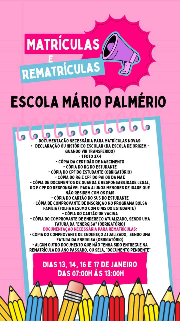 A Escola Mário Palmério comunica aos pais e responsáveis que o período de rematrícula e matrículas para novos alunos para o ano letivo de 2025 já está definido. Garanta a vaga do seu filho dentro do prazo!