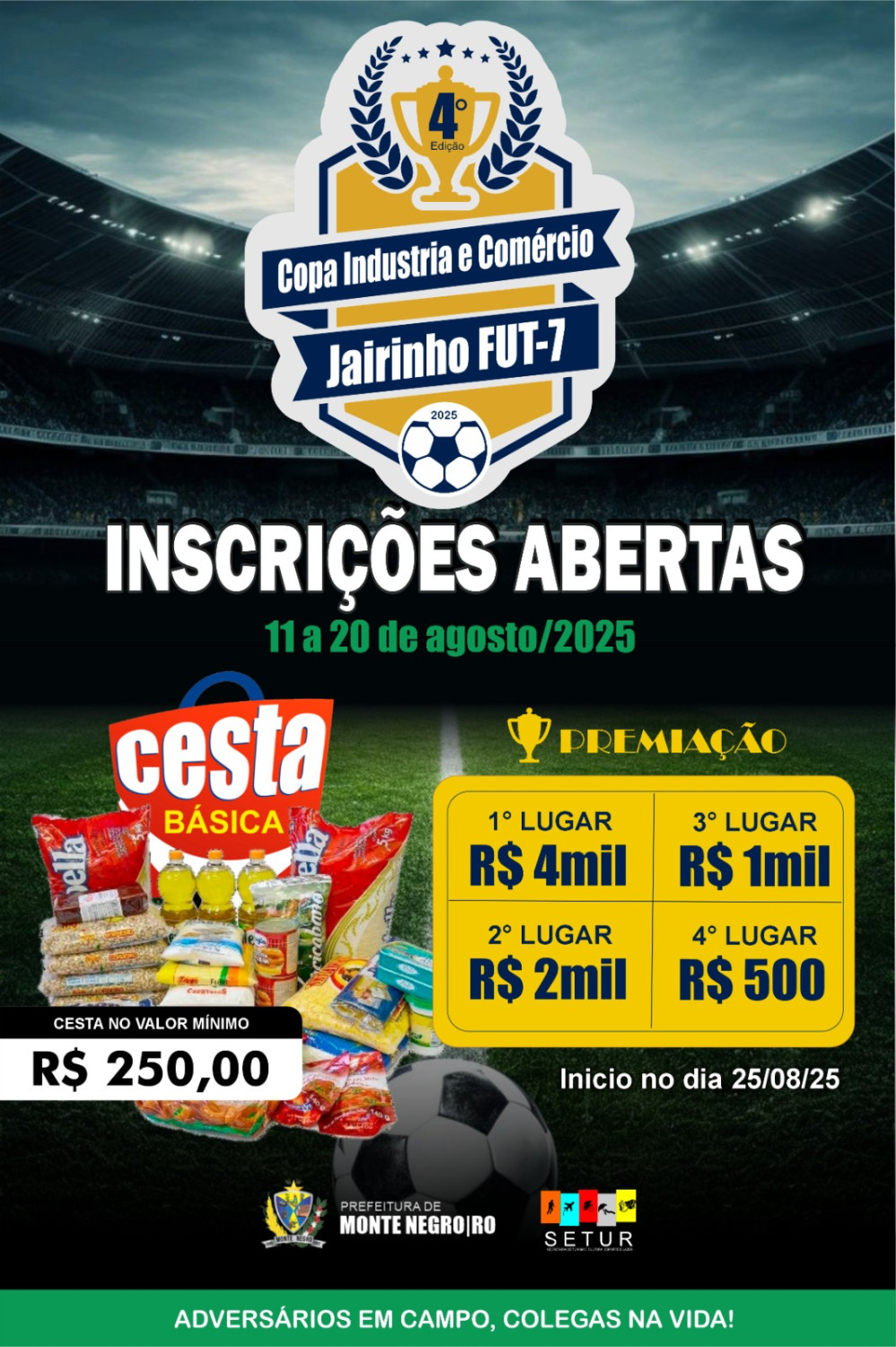 A Prefeitura Municipal de Monte Negro, por meio da Secretaria Municipal de Turismo, Esporte e Lazer (SETUR), informa a realização da 4ª edição da Copa Indústria e Comércio – Jairinho FUT-7, que acontecerá a partir do dia 25 de agosto de 2025.