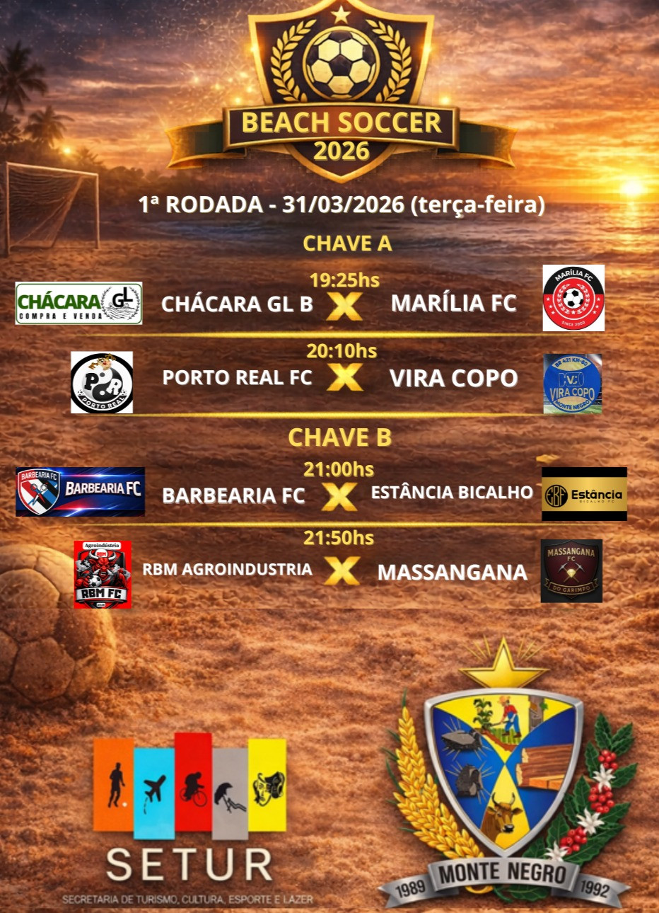 A Prefeitura de Monte Negro, por meio da Secretaria Municipal de Turismo, Cultura, Esporte e Lazer (SETUR), informa a realização da 1ª rodada do campeonato Beach Soccer 2026, que acontecerá no dia 31 de março de 2026 (terça-feira).