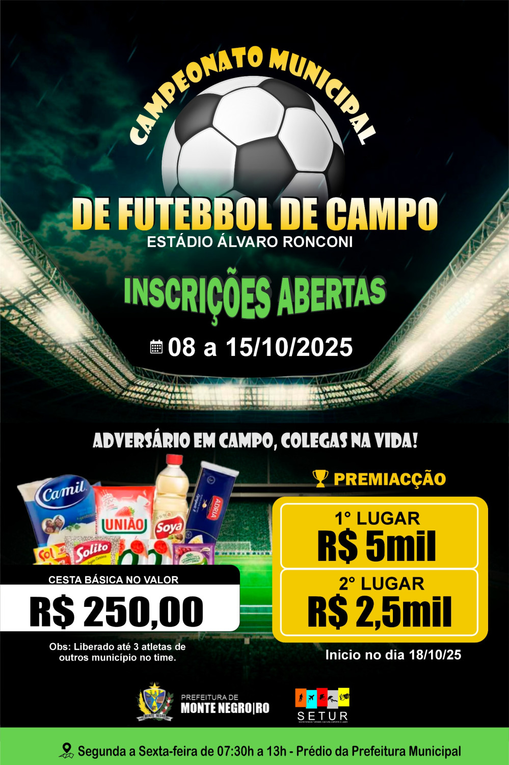 A Prefeitura de Monte Negro, por meio da Secretaria de Esporte, Turismo e Lazer (SETUR), convida todos os atletas e equipes do município a participarem do Campeonato Municipal de Futebol de Campo 2025, que será realizado no Estádio Álvaro Ronconi.