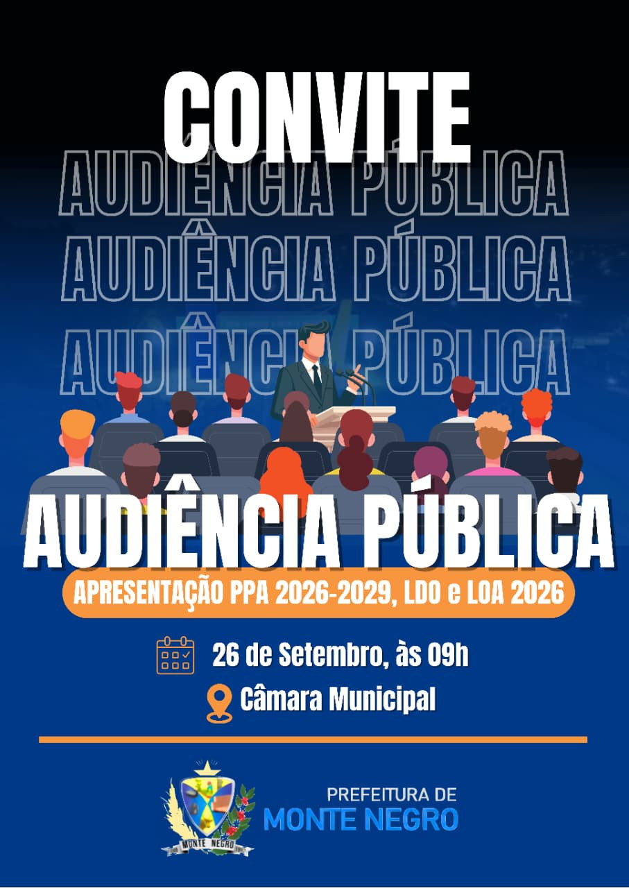 A Prefeitura de Monte Negro convida toda a população para participar da Audiência Pública de apresentação do Plano Plurianual (PPA 2026-2029), da Lei de Diretrizes Orçamentárias (LDO) e da Lei Orçamentária Anual (LOA 2026).