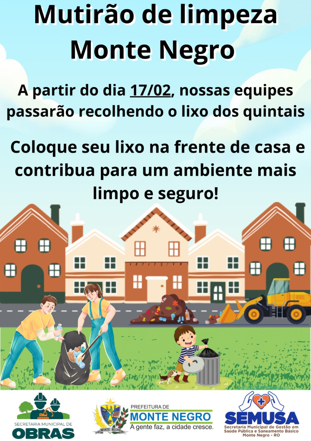 A Prefeitura de Monte Negro, por meio da Secretaria Municipal de Obras e da Secretaria Municipal de Gestão em Saúde Pública e Saneamento Básico (SEMUSA), realizará um Mutirão de Limpeza em toda a cidade a partir do dia 17 de fevereiro.