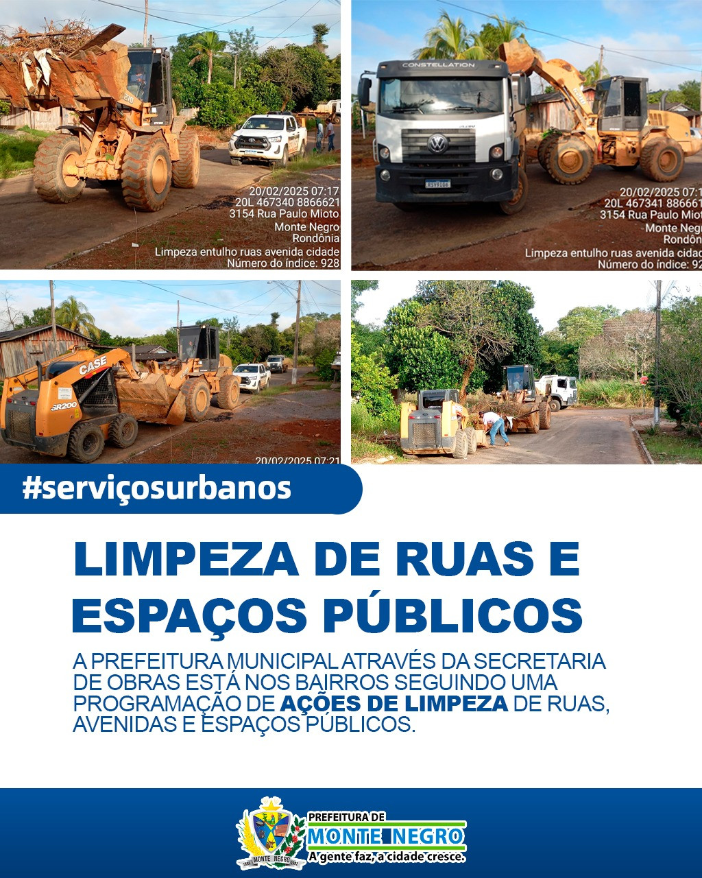 A Prefeitura Municipal de Monte Negro, por meio da Secretaria de Obras, está realizando uma série de ações de limpeza urbana em diversos bairros da cidade. O objetivo é manter ruas, avenidas e espaços públicos limpos, garantindo mais qualidade de vida para a população.