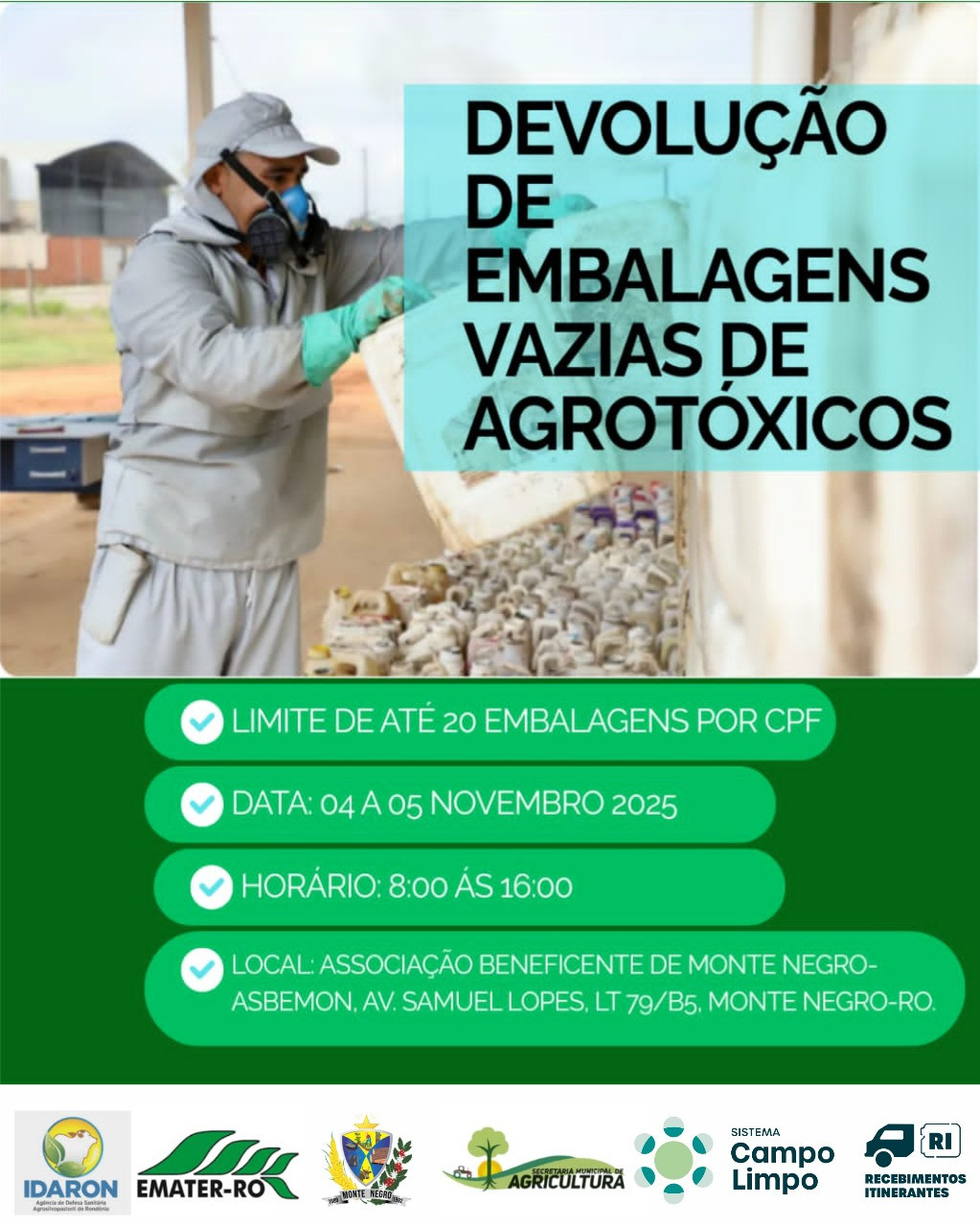 A Secretaria Municipal de Agricultura estará realizando a coleta de embalagens vazias de agrotóxicos nos dias 04 e 05 de novembro de 2025, das 8h às 16h, na ASBEMON – Av. Samuel Lopes, LT 79/B5, Monte Negro-RO.