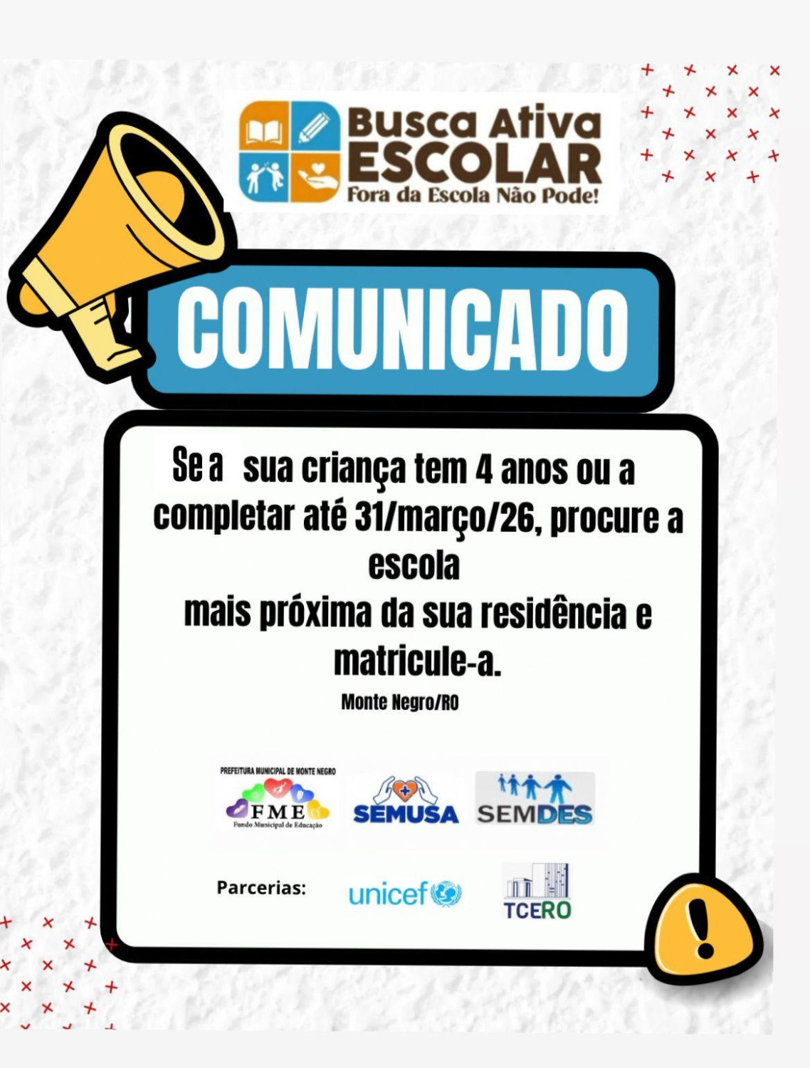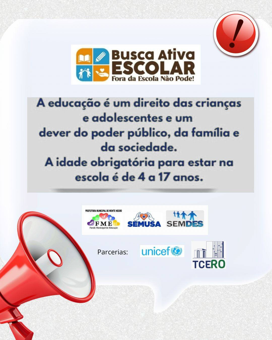 A Prefeitura Municipal de Monte Negro, por meio da Secretaria Municipal de Educação (SEMEC) e em parceria com o UNICEF, reforça o compromisso com o direito constitucional à educação.