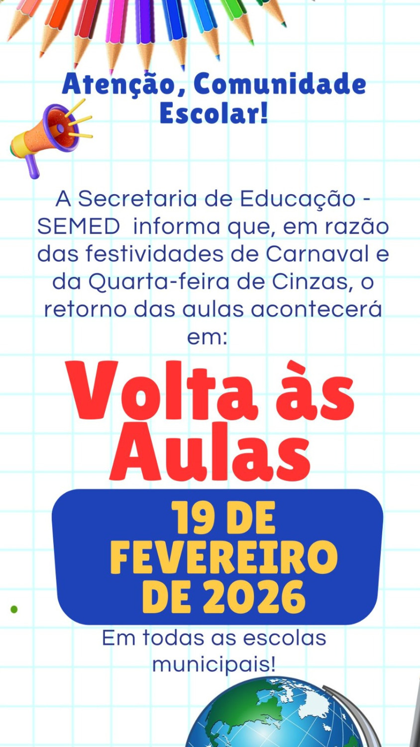 A Prefeitura de Monte Negro, por meio da Secretaria Municipal de Educação (SEMED), informa a toda a comunidade escolar que, em razão das festividades de Carnaval e da Quarta-feira de Cinzas, o retorno das aulas na Rede Municipal de Ensino ocorrerá no dia 19 de fevereiro de 2026.