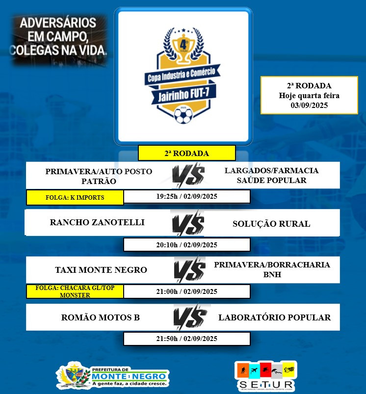 A Prefeitura de Monte Negro, por meio da Secretaria Municipal de Esporte, Turismo e Lazer (SETUR), divulga a programação da 2ª rodada da 4ª Copa Indústria e Comércio Jairinho Fut-7, competição que tem como objetivo incentivar a prática esportiva, promover a integração entre trabalhadores do comércio e da indústria local, além de fortalecer o convívio social por meio do esporte.