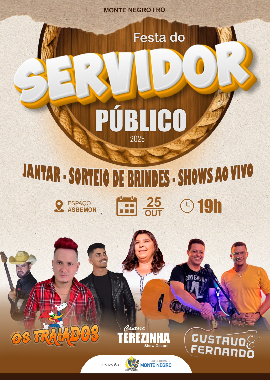 A Prefeitura de Monte Negro (RO) realizará, no dia 25 de outubro de 2025, a tradicional Festa do Servidor Público, em homenagem a todos os profissionais que contribuem diariamente para o desenvolvimento do município e o bom funcionamento dos serviços públicos.