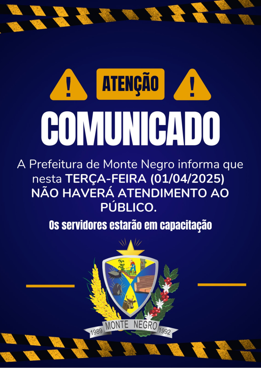 A Prefeitura de Monte Negro informa à população que nesta terça-feira, dia 01 de abril de 2025, não haverá atendimento ao público em virtude de capacitação dos servidores.