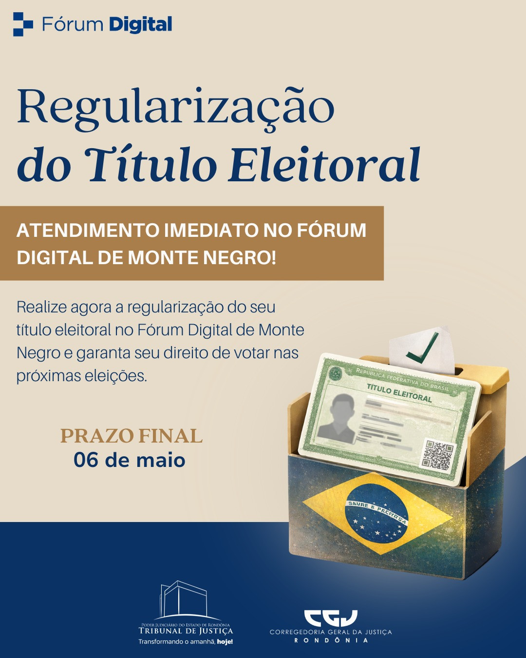 O Fórum Digital de Monte Negro, em parceria com o Tribunal de Justiça do Estado de Rondônia (TJRO) e a Corregedoria Geral da Justiça, comunica a todos os cidadãos que o serviço de regularização do título eleitoral já está disponível com atendimento imediato.