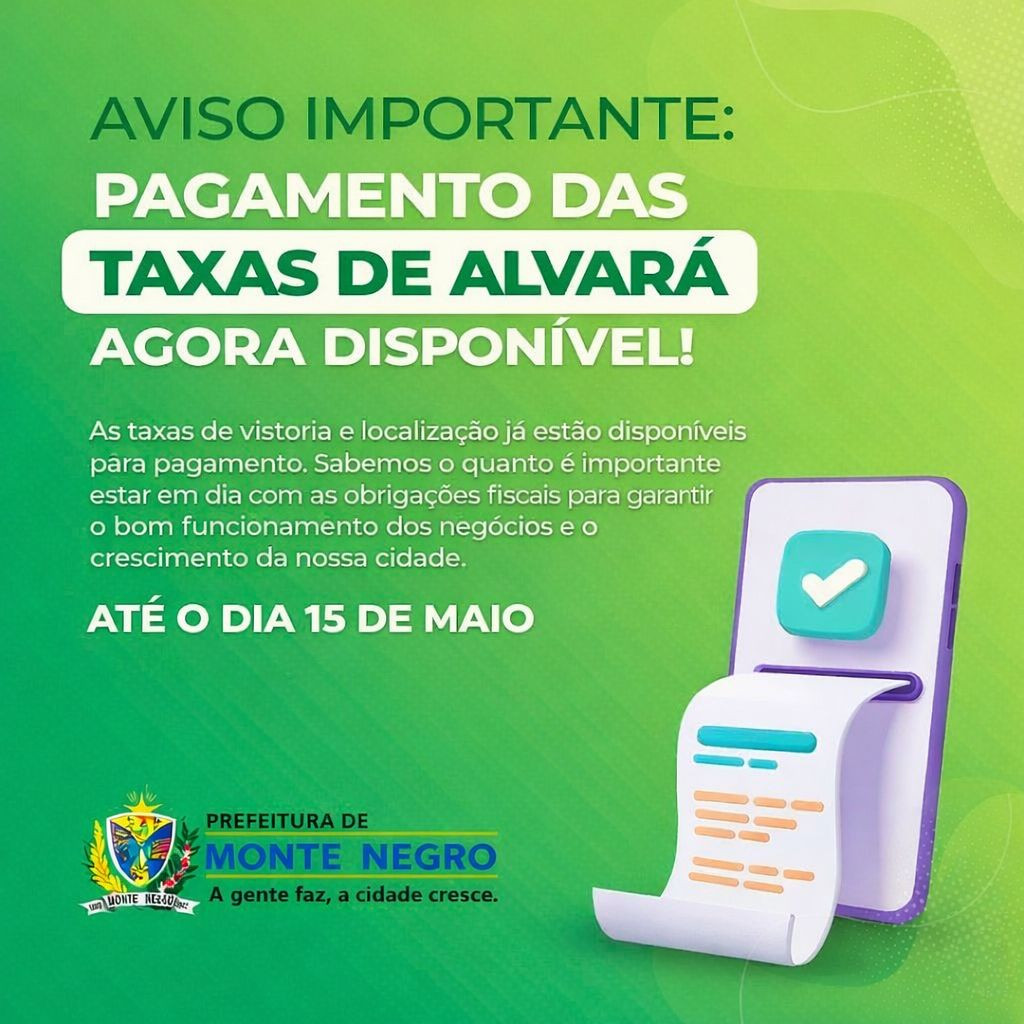A Prefeitura de Monte Negro informa que as Taxas de Vistoria e Localização para o exercício de 2026 já podem ser quitadas. Manter o seu negócio regularizado é fundamental para garantir a tranquilidade das suas operações e contribuir diretamente para o desenvolvimento econômico do nosso município.