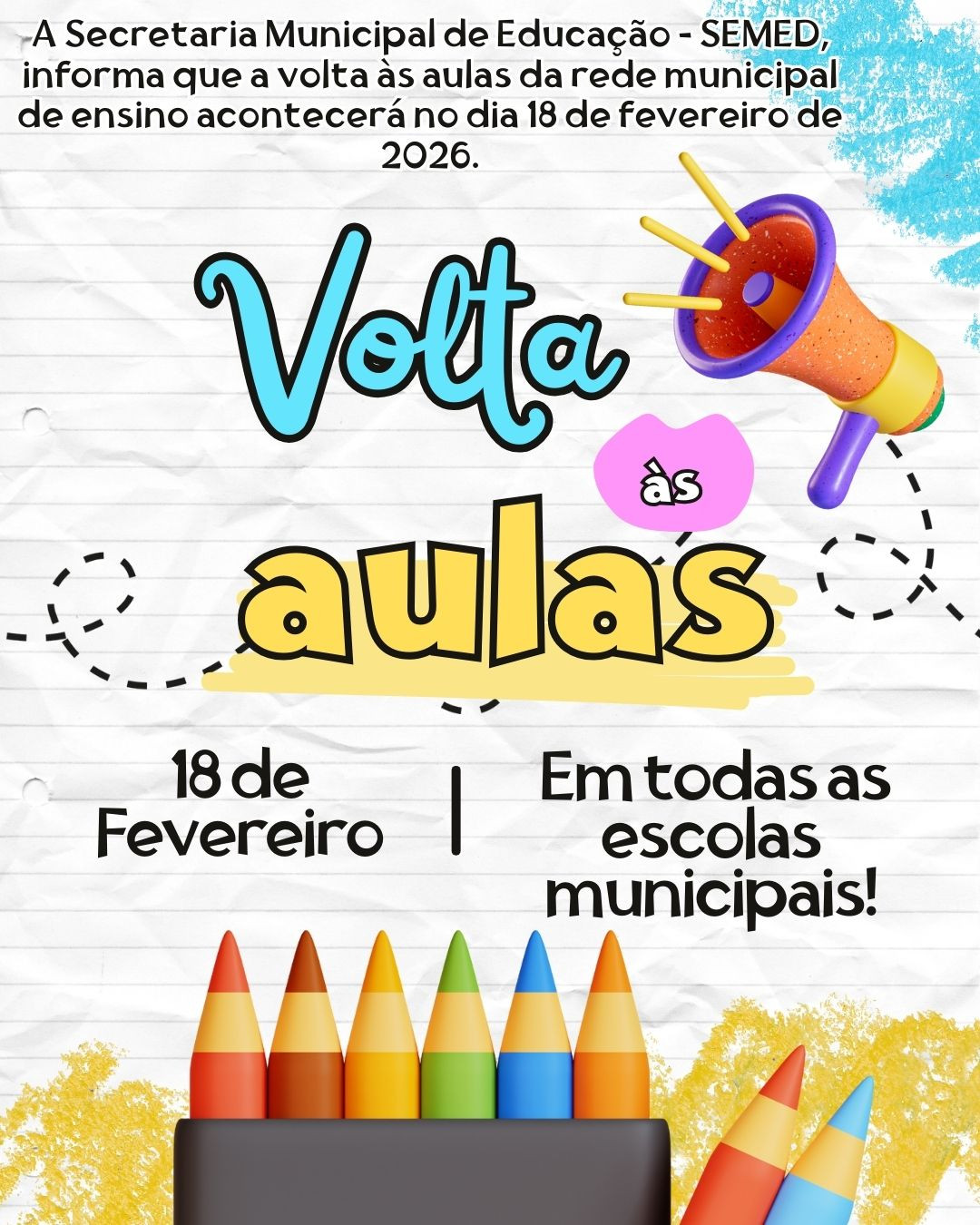 A Secretaria Municipal de Educação (SEMED) informa à população que o retorno das aulas da rede municipal de ensino de Monte Negro – RO está previsto para o dia 18 de fevereiro de 2026, em todas as escolas municipais.
