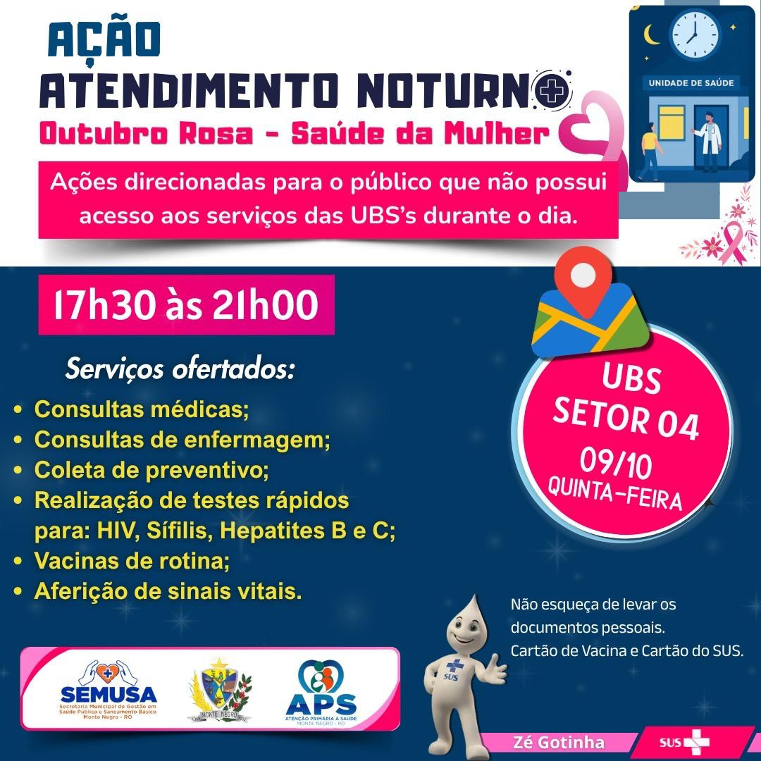 A Prefeitura de Monte Negro, por meio da Secretaria Municipal de Saúde (SEMUSA), realiza nesta quinta-feira, 09 de outubro, mais uma edição da Ação de Atendimento Noturno, com foco especial na Saúde da Mulher, dentro da campanha Outubro Rosa.