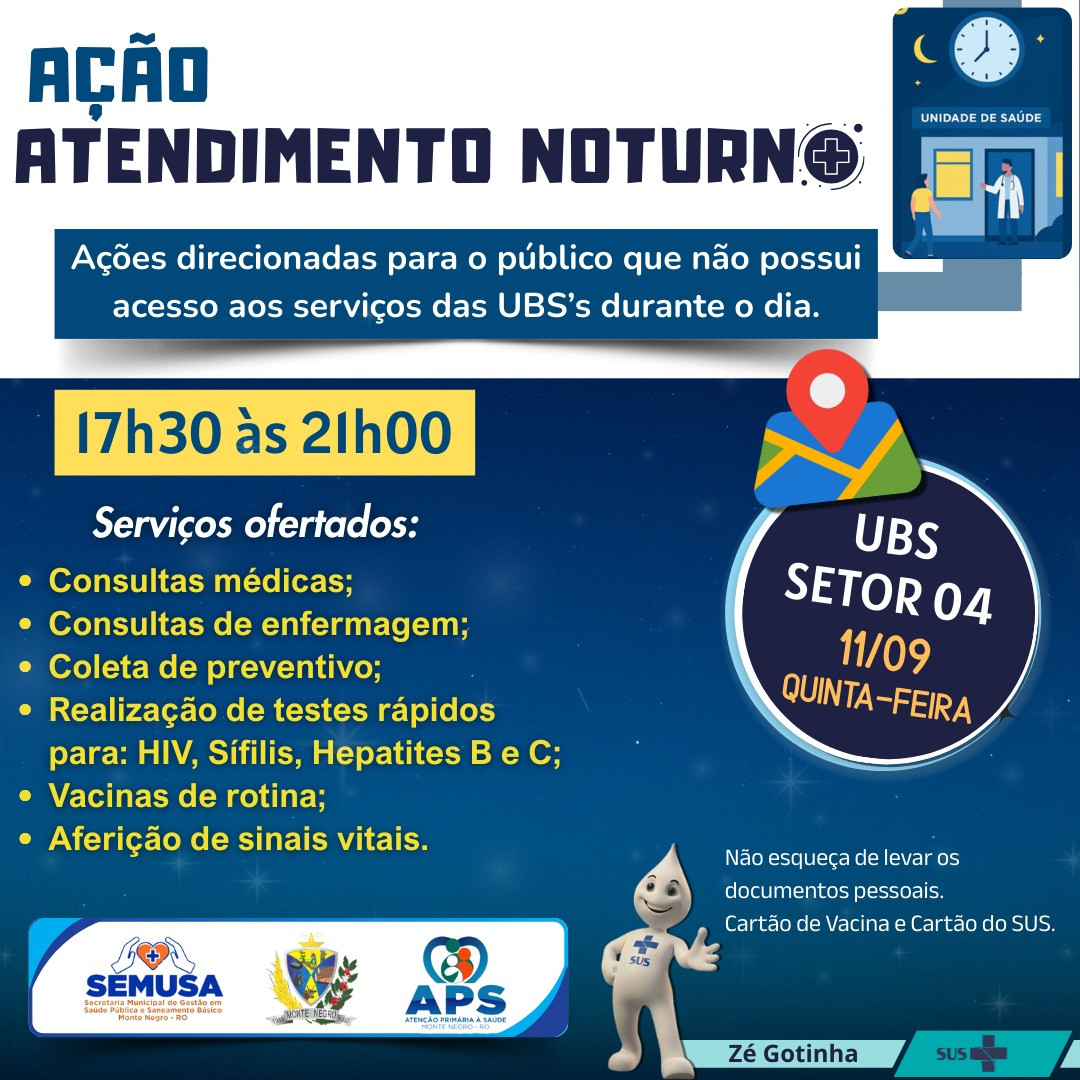 Com o objetivo de ampliar o acesso da população aos serviços de saúde, a Secretaria Municipal de Saúde (SEMUSA) promoveu, no dia 11 de setembro, na UBS Setor 04, a Ação de Atendimento Noturno, voltada especialmente para os cidadãos que não conseguem utilizar os serviços das Unidades Básicas de Saúde durante o dia.