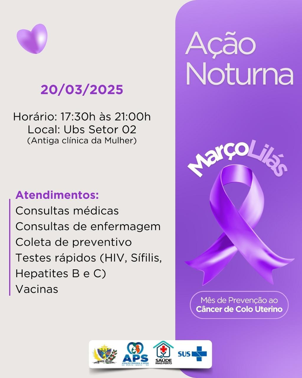 A Prefeitura de Monte Negro, por meio da Secretaria Municipal de Saúde, convida todas as mulheres para participar da Ação Noturna - Março Lilás, uma iniciativa voltada à conscientização e prevenção do câncer de colo uterino.