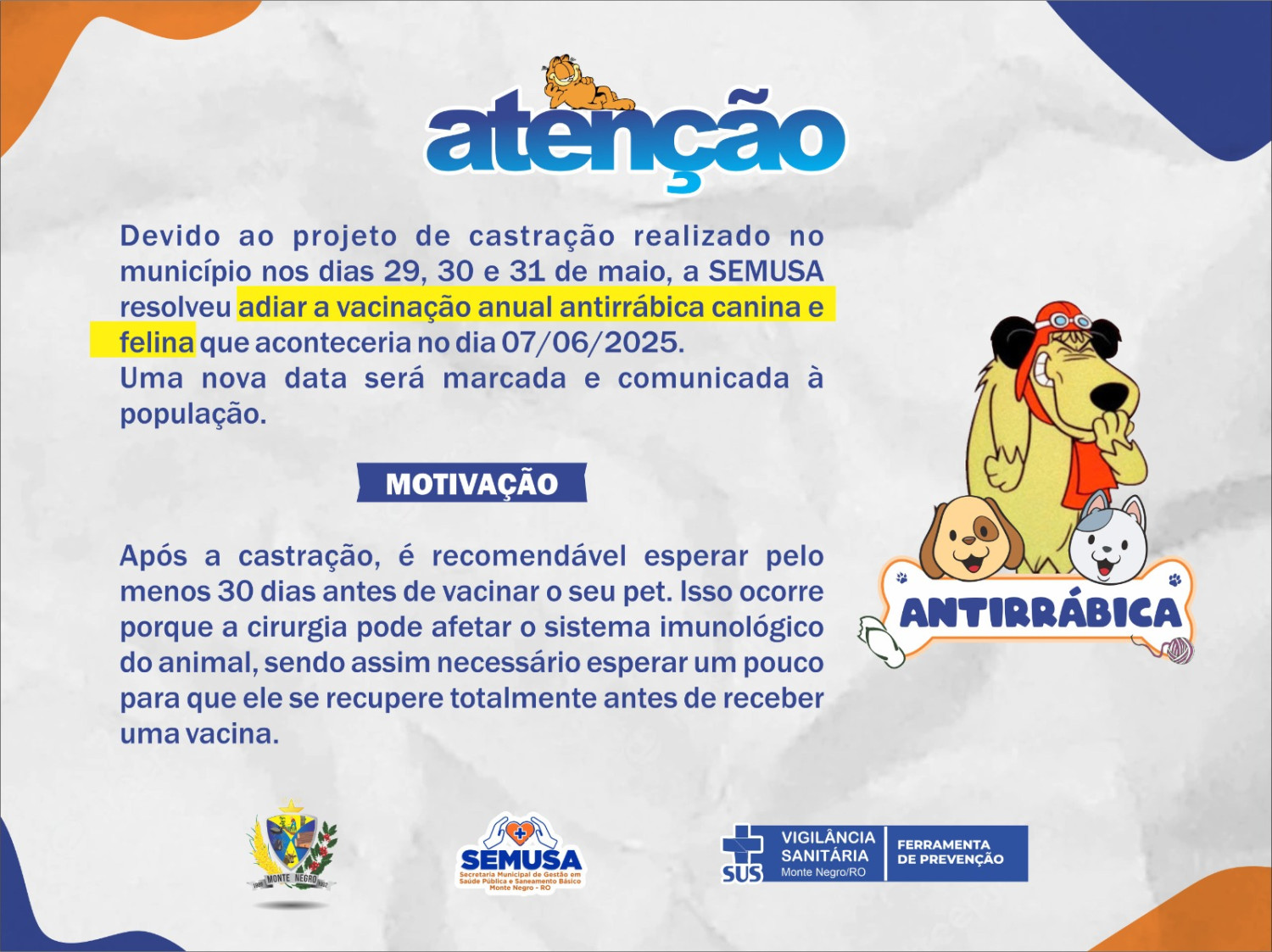 A Prefeitura Municipal de Monte Negro, por meio da Secretaria Municipal de Saúde (SEMUSA), informa que a vacinação anual antirrábica canina e felina, anteriormente agendada para o dia 07 de junho de 2025, foi adiada.