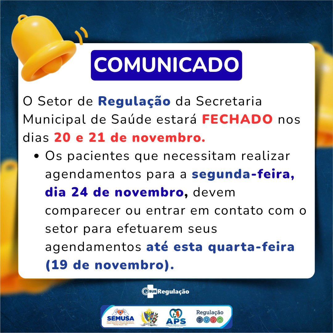 O Setor de Regulação da Secretaria Municipal de Saúde estará fechado nos dias 20 e 21 de novembro.
