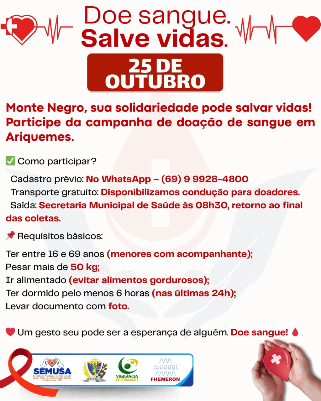 A Prefeitura Municipal de Monte Negro, por meio da Secretaria Municipal de Saúde (SEMUSA) e da Vigilância Epidemiológica, em parceria com o FHEMERON, convida toda a população a participar da Campanha de Doação de Sangue, que será realizada no dia 25 de outubro, em Ariquemes.