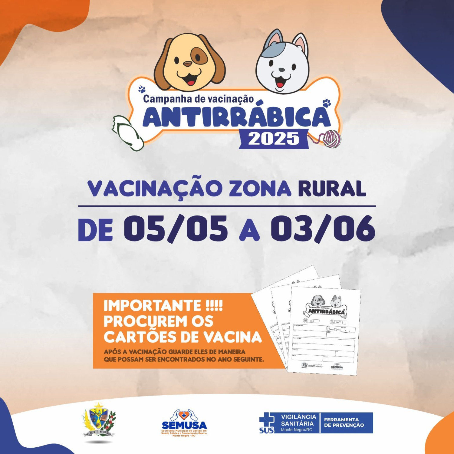 A Prefeitura de Monte Negro, por meio da Secretaria Municipal de Saúde (SEMUSA) e da Vigilância Sanitária, informa que a Campanha de Vacinação Antirrábica 2025 já tem data marcada para a zona rural!