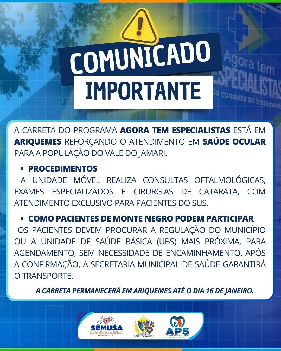 A Carreta do programa Agora Tem Especialistas está em Ariquemes, oferecendo consultas, exames oftalmológicos e cirurgias de catarata, com atendimento exclusivo pelo SUS.