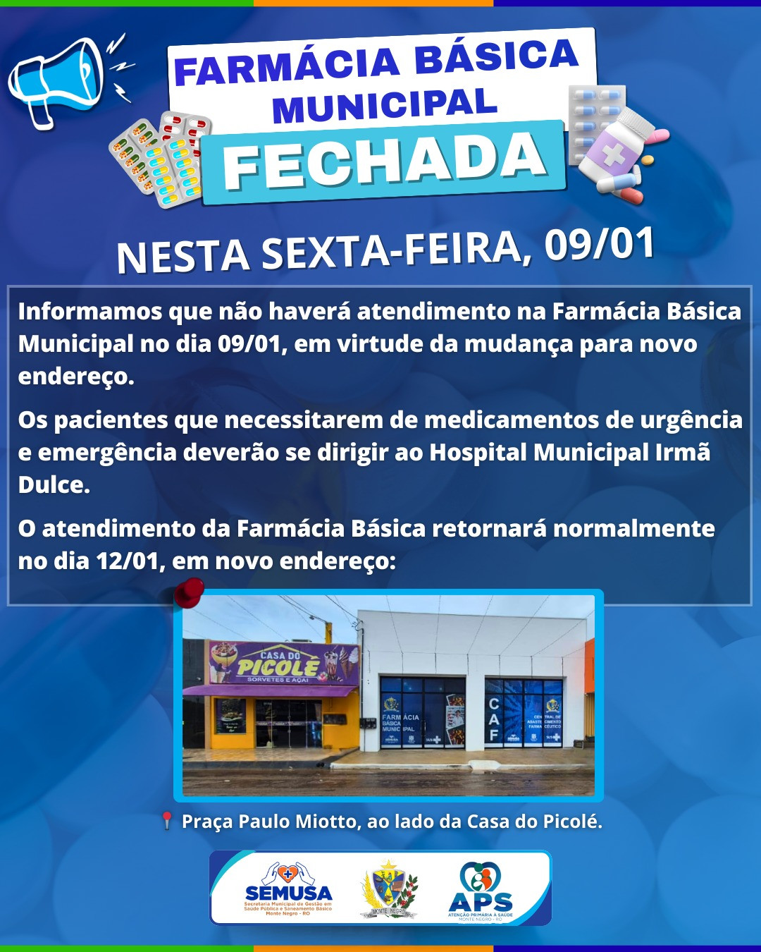 Comunicamos que não haverá atendimento na Farmácia Básica Municipal nesta sexta-feira, 09/01, em razão da mudança para um novo endereço.