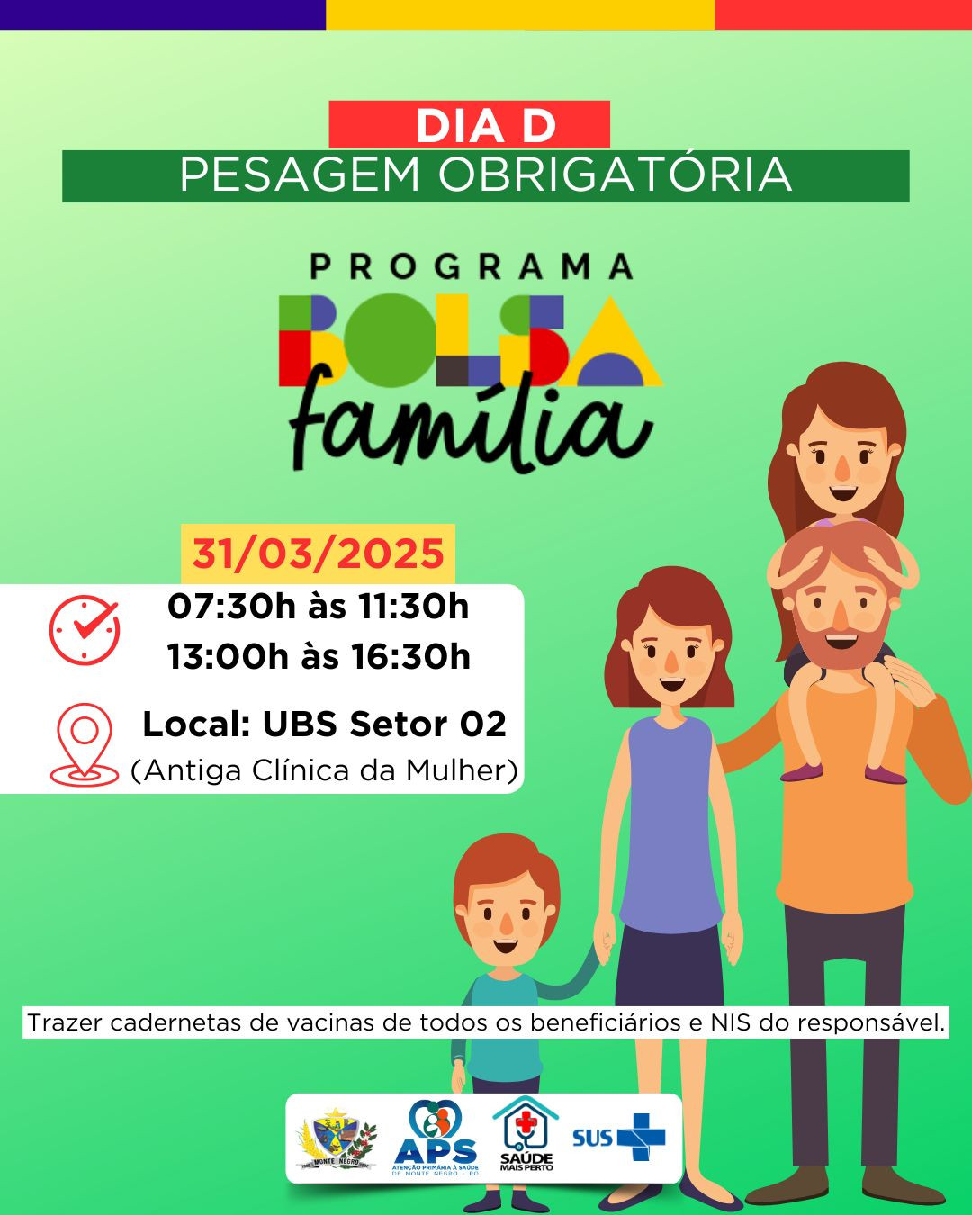 A Prefeitura Municipal, por meio da Secretaria Municipal de Saúde, convida todos os beneficiários do Programa Bolsa Família para participarem do Dia D da Pesagem Obrigatória, que acontecerá no dia 31 de março de 2025 (segunda-feira) na UBS do Setor 02 (Antiga Clínica da Mulher).