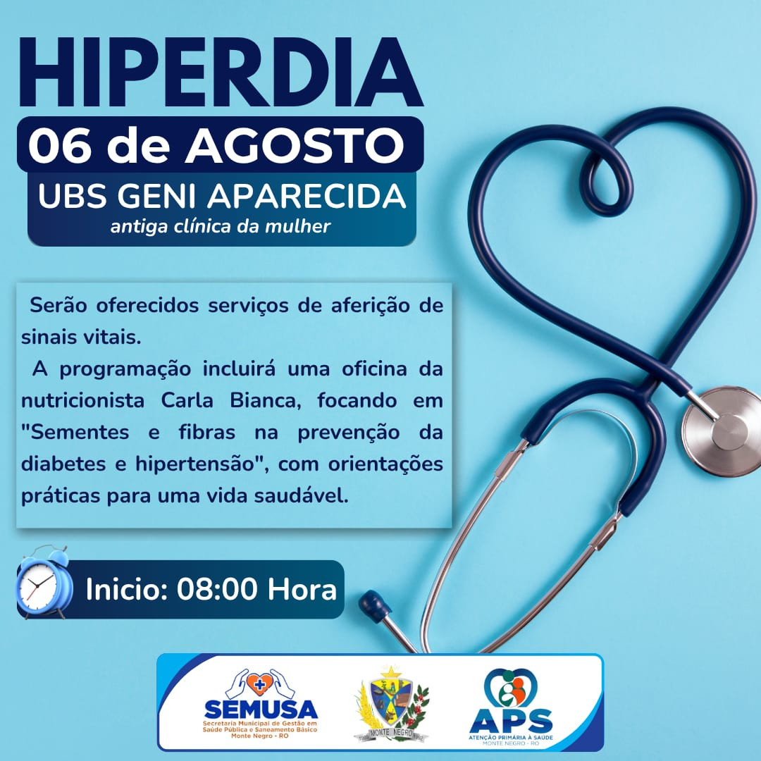 Na próxima quarta-feira, dia 06 de agosto, a Prefeitura de Monte Negro, por meio da Secretaria Municipal de Saúde (SEMUSA), realizará mais uma importante ação do programa HIPERDIA na UBS Geni Aparecida (antiga Clínica da Mulher), com início às 08h da manhã.