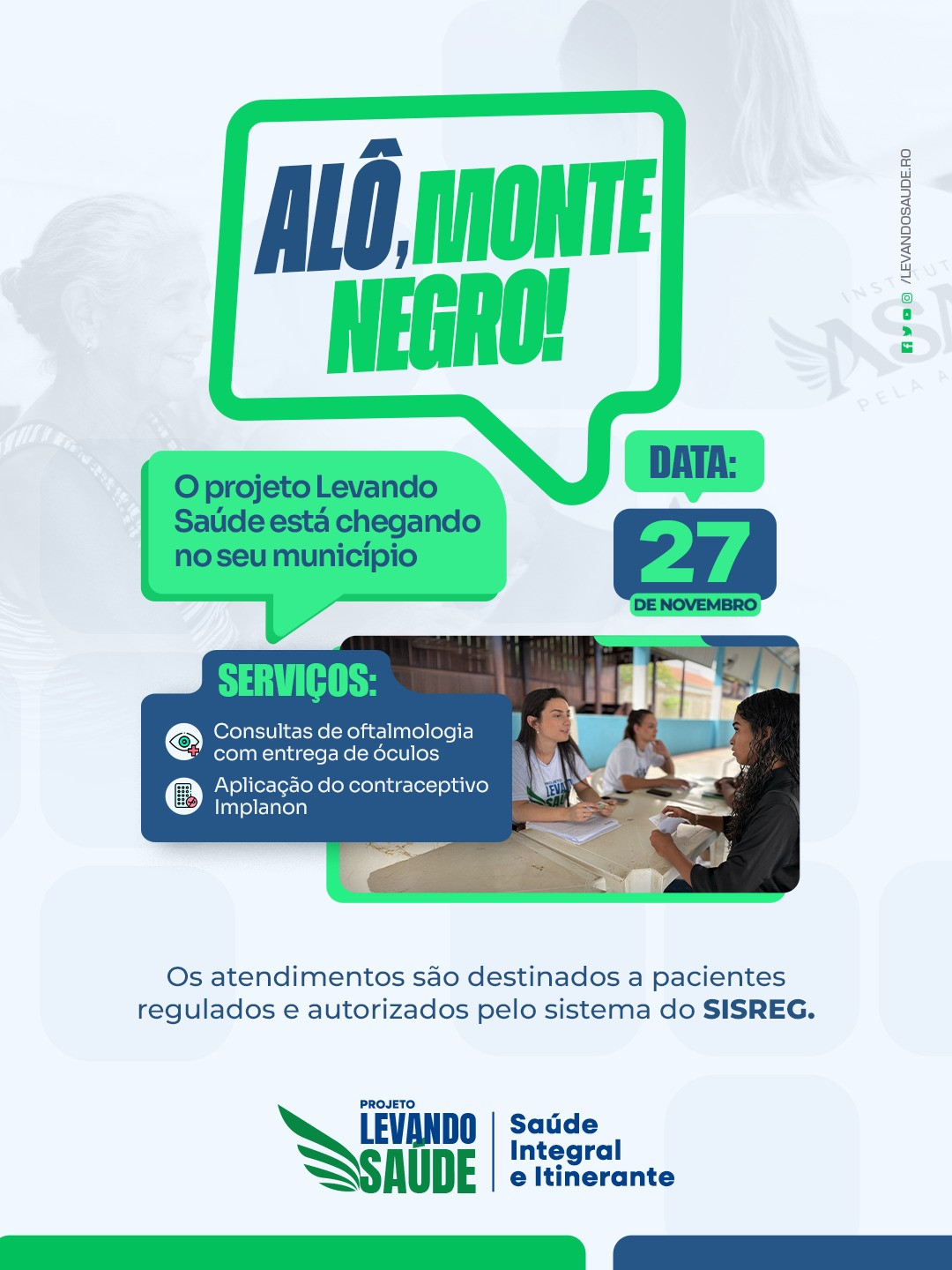 A Prefeitura Municipal de Monte Negro, por meio da Secretaria Municipal de Saúde, informa à população que o Projeto Levando Saúde – Saúde Integral e Itinerante estará realizando atendimentos no município no dia 27 de novembro.