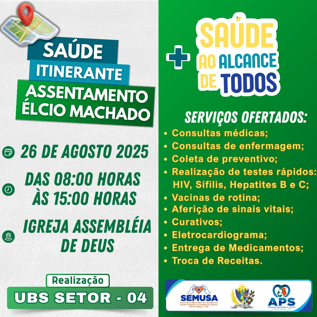 A Prefeitura Municipal de Monte Negro, por meio da Secretaria Municipal de Saúde (SEMUSA) e da equipe da Atenção Primária à Saúde (APS), realizará no próximo dia 26 de agosto de 2025 mais uma ação do programa Saúde Itinerante, levando atendimento médico e de enfermagem ao Assentamento Élcio Machado.